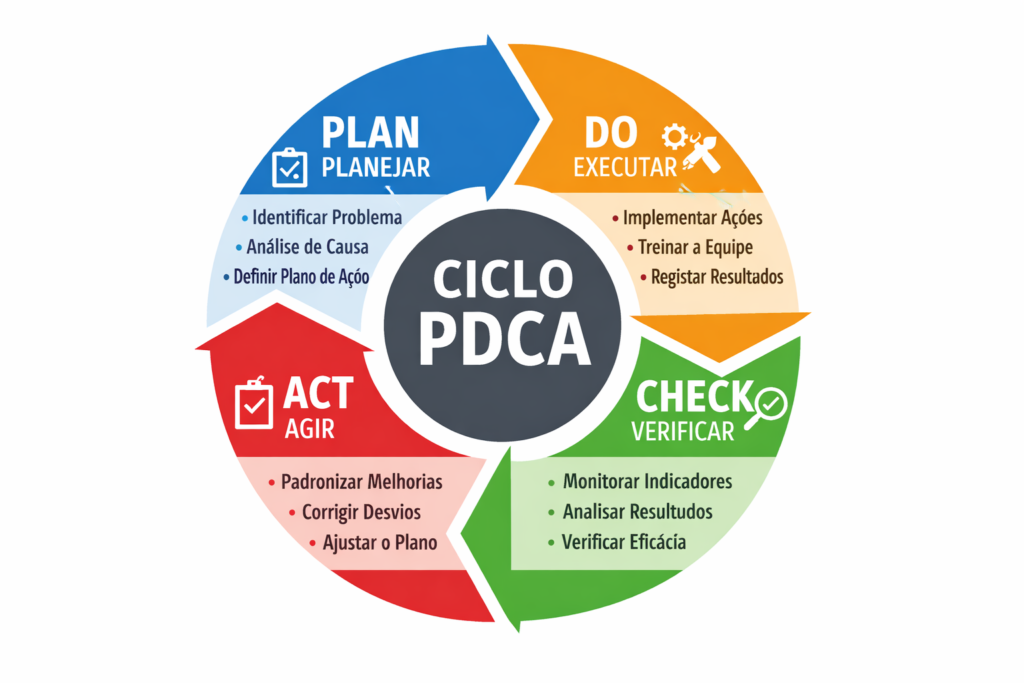 Amplamente utilizado em sistemas baseados na ISO 9001, o PDCA permite controlar processos, corrigir desvios e promover a melhoria contínua de forma sistemática.